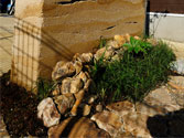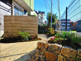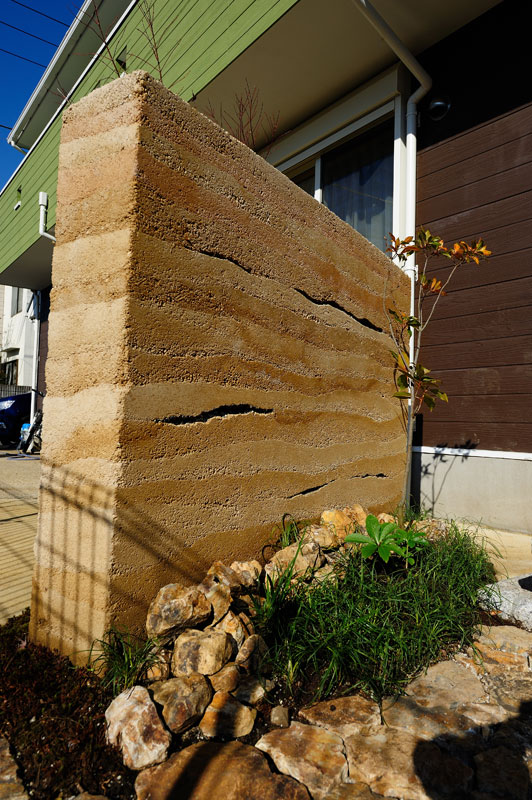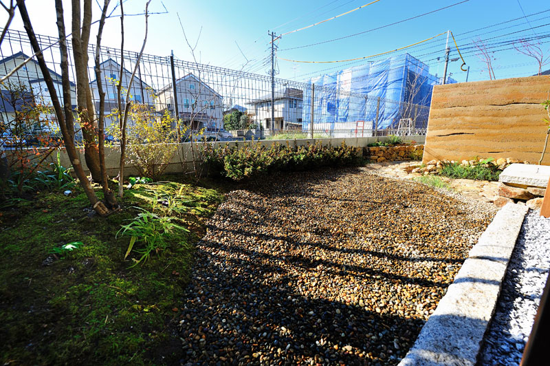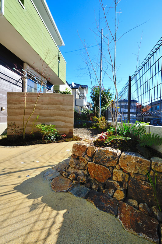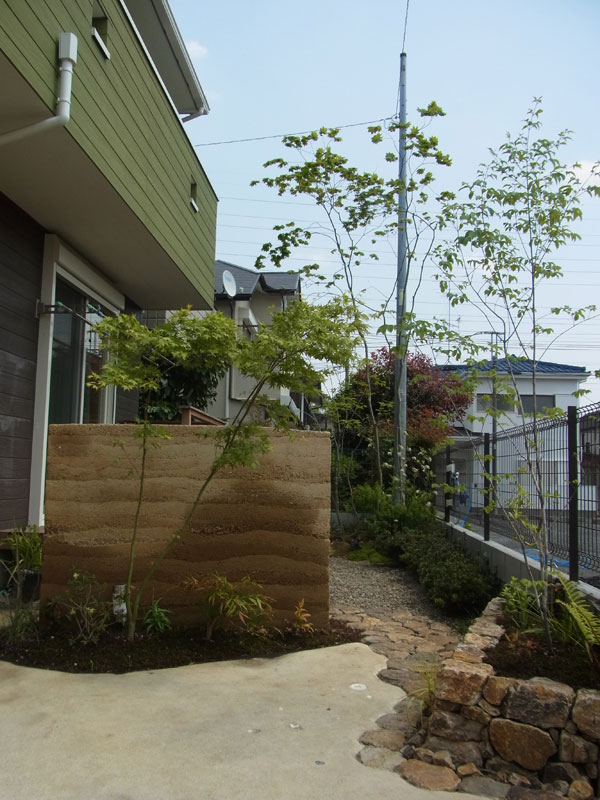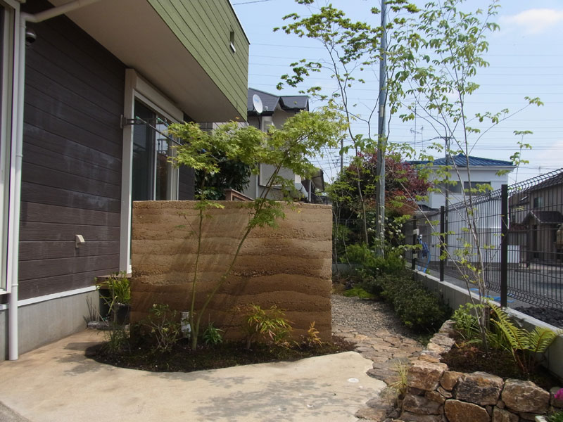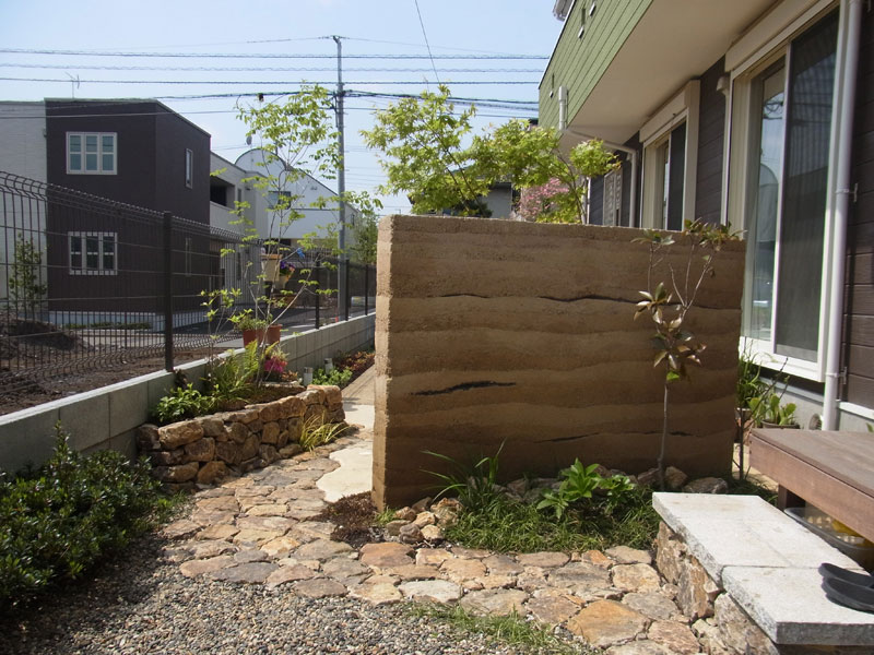 庭の中心部はバーベQやお子様達が遊べるように広く取り、奥様の希望でもあった版築土塀は通りからの目隠しとして、少し奥行を出すために斜めに施工しました。土塀の色や質感に合わせて、花壇石積み、洗い出しを決めていきました。