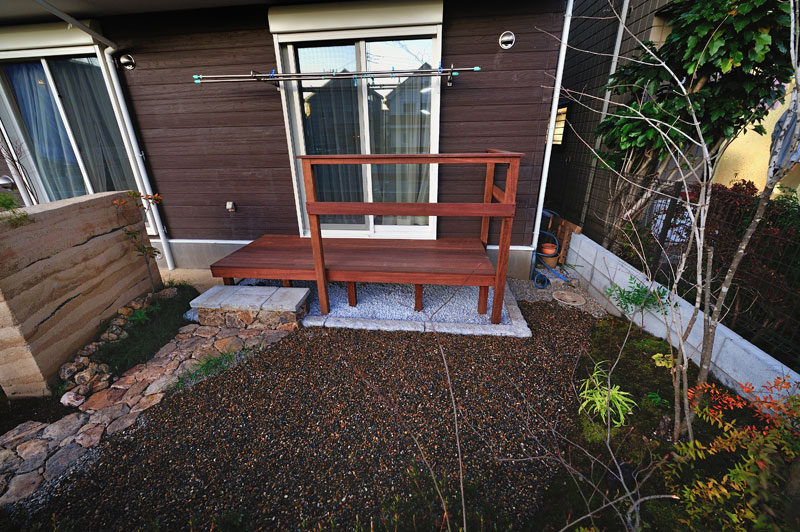 庭の条件としてなるべく管理の手間のかからないように、と洗濯物が干せるデッキがほしいとの要望があったので、デッキ材は耐久性のあるハードウッドのジャラ材を使用し植栽部分も管理のしやすいように配置しました。