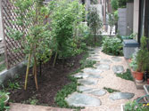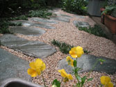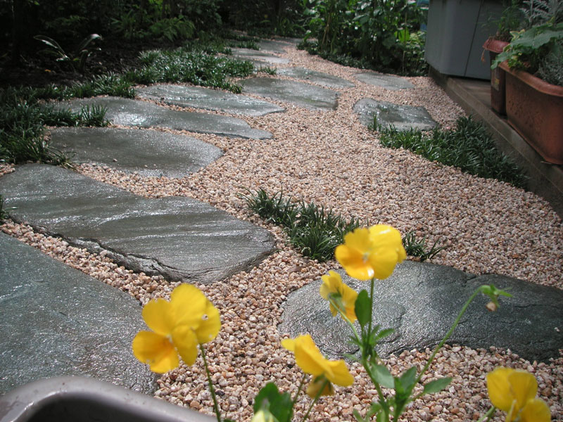 雨が降ったとき足場が汚れないようにして欲しいとの依頼で青の鉄平石と伊勢砂利で歩きやすくしました。砂利の下には防草シートを貼ってあり草も防いでくれます。