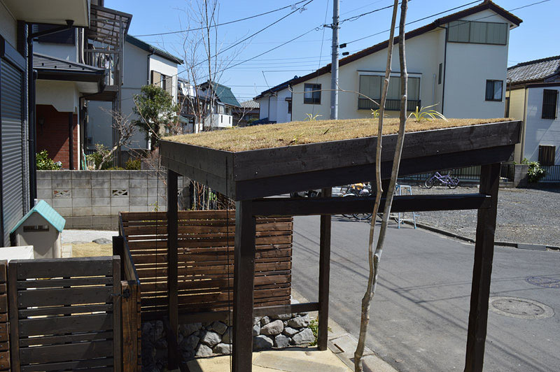 色味や雰囲気、を建築と調和させ、ドッグランとしての閉鎖されたスペースから玄関周りのオープンスペースへのつながりもサイクルポートを手作業で作ったことによって自然感がでてなじみました。駐車場やサイクルポートなど庭のスペースではないところも作り方によっては庭の一部としてみることができます。草屋根のサイクルポートは植栽スペースの少ない場所でも緑を楽しむことができます。