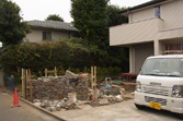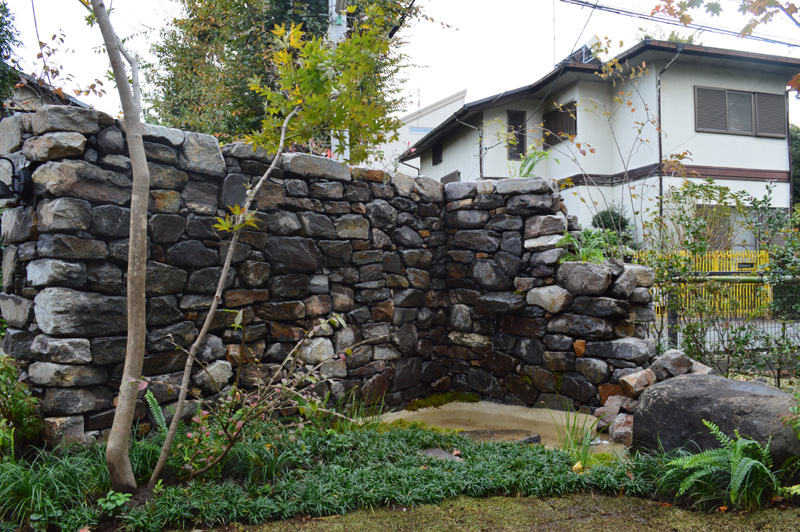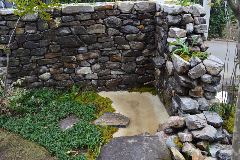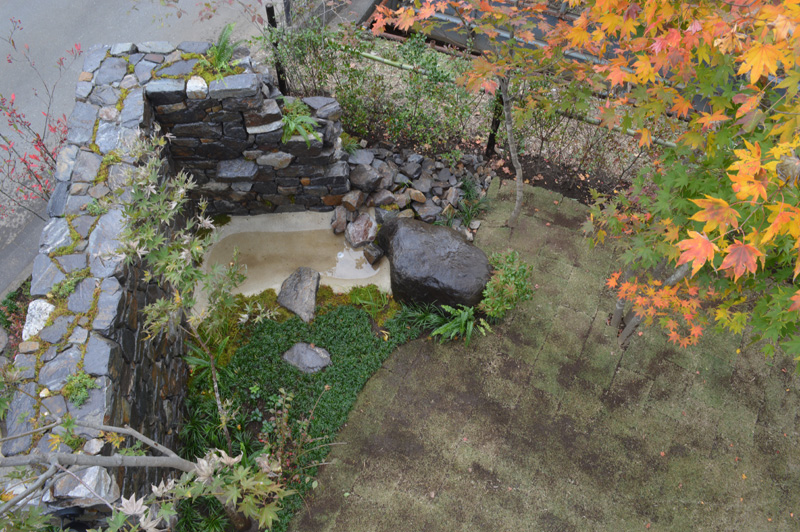 庭の部分になる門袖の石積みの内側からは水が流れでて水のたまり場をつくりました。これはお施主様のお子様たちが水場で遊べるようにとつくりました。