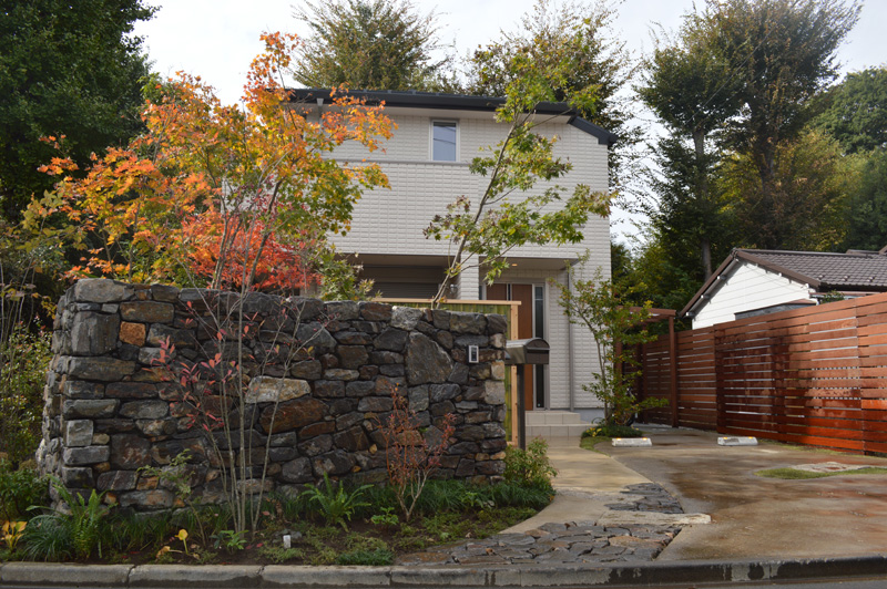 門袖は石積みで力強さを出してアプローチと駐車場は同じラインで仕切り、芝生、石の素材を織り交ぜることによって一体感をだしました。