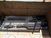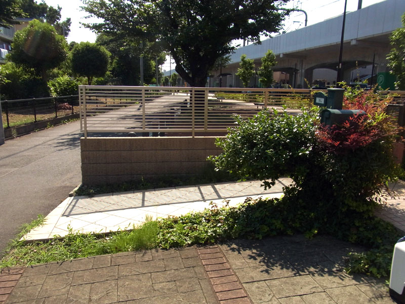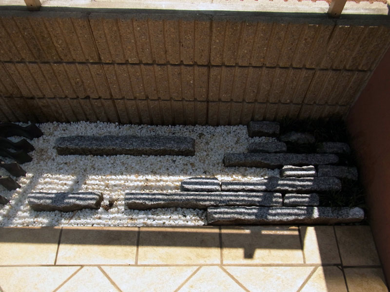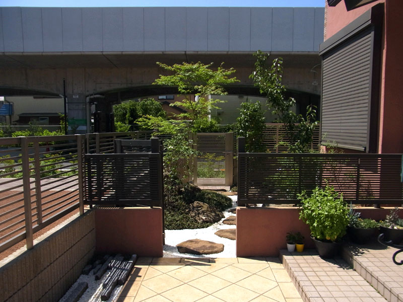 家の目の前には中央線が走っており、古瓦を線路に見立てそのまま弧を描いて中央線の線路につなげるイメージでつくり、白玉砂利とタマリュウで化粧しました。