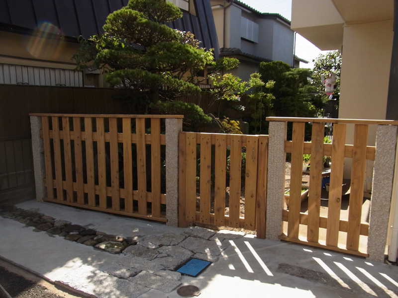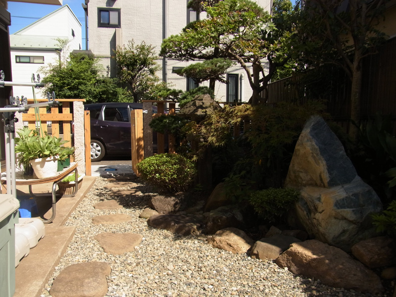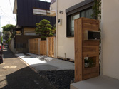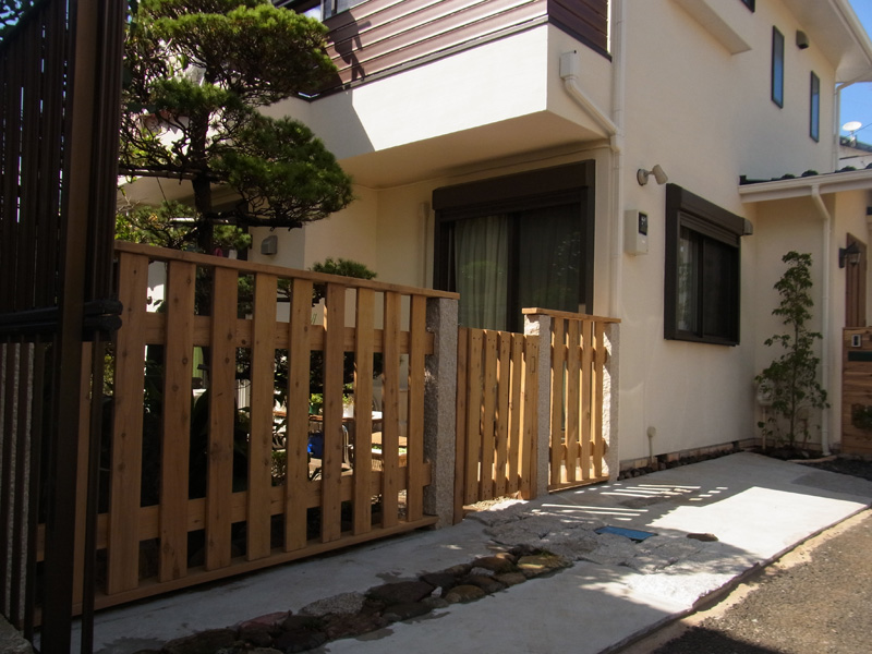 既存の庭は五葉松や大名竹などがある昔ながらの和の庭で、新たにリフォームした建物の外観は白を基調とした雰囲気だったのでどちらにも繋がるように仕切りの板塀の柱は御影石をつかい、板材は木目のきれいなサイプレスを使用しました。