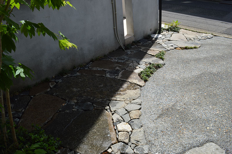 駐車スペースには大きめの石を使った石張りを手前から奥に向かって広がるように張ることでより空間を大きく見せる様に工夫しました。