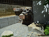 駐車場奥の高低差は石積で土留めをして石張りからの流れをそのまま繋げました。