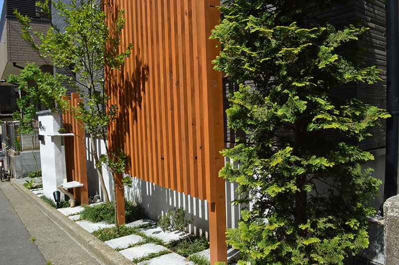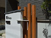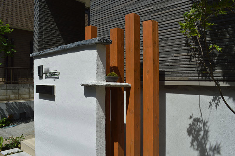 門袖や窓の前の目隠しウッドフェンスの部分はお施主様のご希望にそった色や大きさをとりいれました。