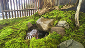 古い枯木、と青々とした苔の緑では相反するものですが、そこに時代を感じることができ、水の流れを合わせることで生命の力強さを表現しました。