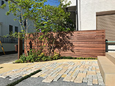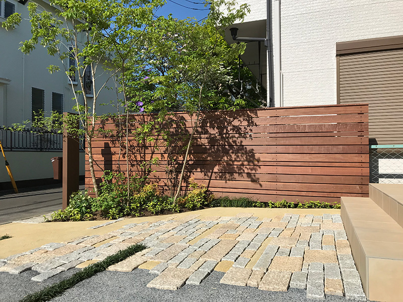 お隣との境界はハードウッドフェンスで仕切り、フェンス前に植栽スペースを設けて玄関前を彩りました。