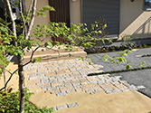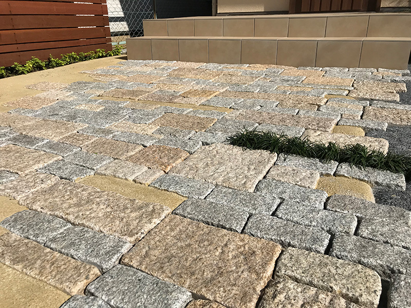アプローチは玄関までの動線で毎日通るスペースなので趣のある数種類の御影石をモザイク柄にはり、変化を付けました。
