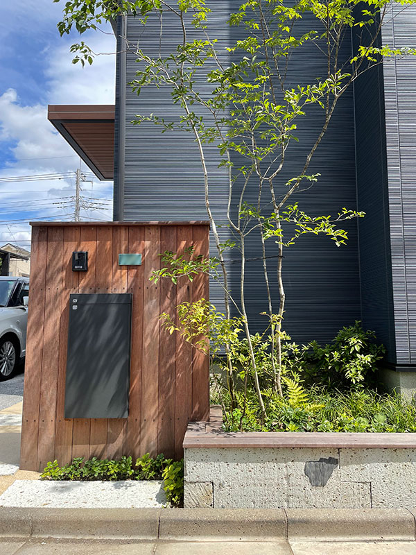 同じ素材を使うことで統一感が生まれます。玄関前の門柱周りの植栽スペースには管理の楽な雑木をメインに四季楽しめる宿根草や低木を植えて、玄関前を四季の変化を楽しめる植栽スペースとしました。