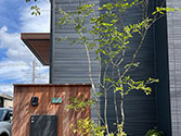 ご夫婦共働きでお庭の管理する時間がないとの事でしたので植栽スペースは最低限に抑ええましたが、玄関前わずか3畳ほどのスペースですがアオダモ株立ちを2本組み合わせグランドカバー、ツツジなどで四季を感じる癒しの空間を作ることができました。