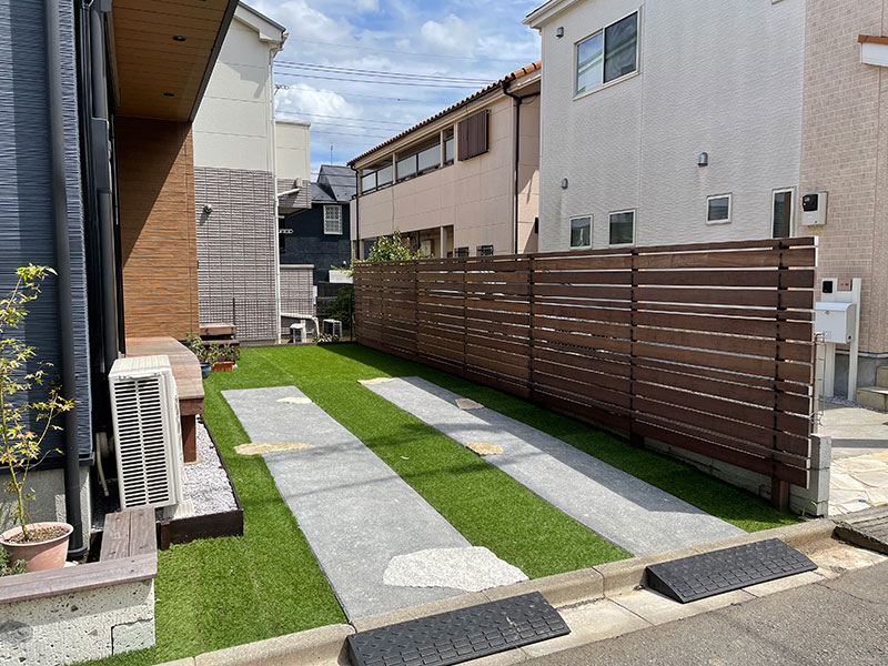 お庭側には人工芝とイタウバ製のハードウッドのデッキ、、ウッドフェンス、駐車スペースにはタイヤの乗り入れるスペースのみでコンクリートの洗い出し、アクセントに御影石を埋め込みました。